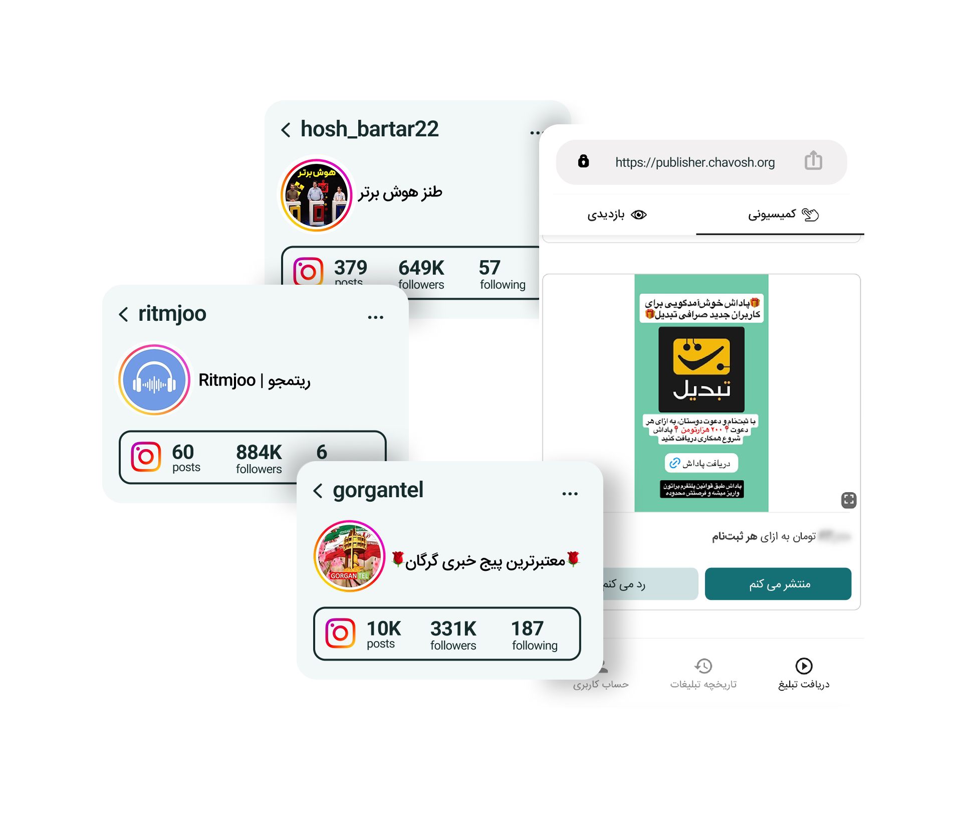 چاوش، نخستین و بزرگترین پلتفرم تبلیغات عملکردمحور در شبکههای اجتماعی است. هزاران ناشر فعال در اینستاگرام، تلگرام و پیامرسانهای داخلی آماده همکاری در کمپین شما هستند.